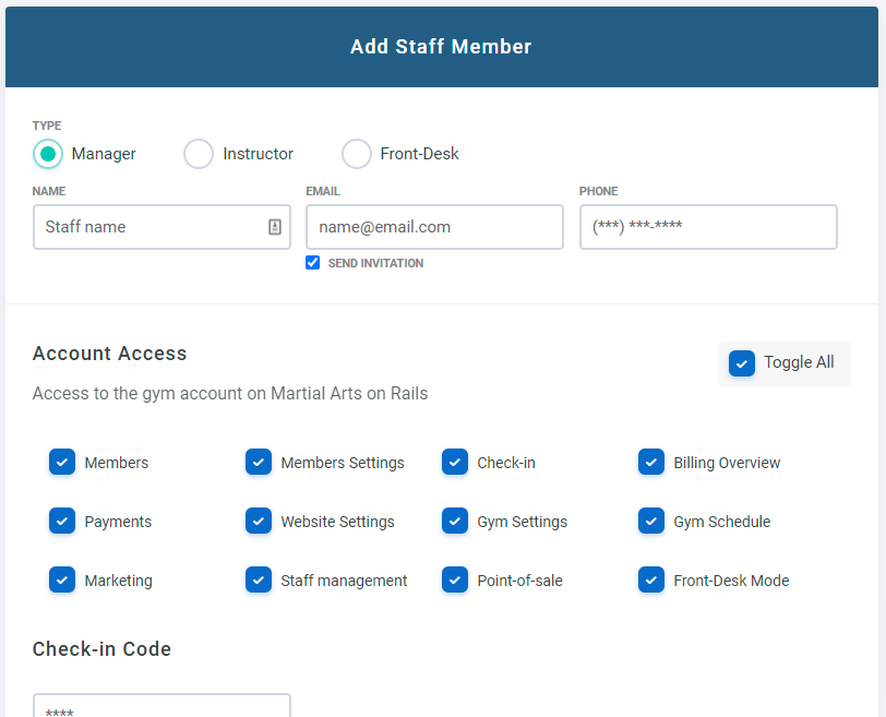 The Front Desk type is a special type of user that only has access to the front desk mode. This allows you to create a user account that can be shared between multiple people, and save its access credentials on a public tablet without concern that people might be able to access your account. - Send Invitation: If you keep this checkbox checked, the staff member will be sent an invitation to join your account as a full user. Keep this checked if you want them to have their own user account. Uncheck this for instructors who don't actually use the software.