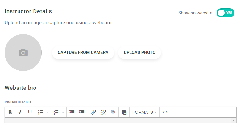 You can upload a photo of the instructor for their website instructor page, as well as set a bio to be shown there - information about their rank and lineage, competition history and teaching credentials. If you would prefer not to show a specific instructor on the website, you can toggle off the "Show on Website" option at the top-right.