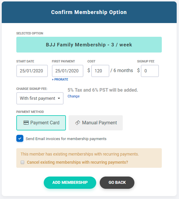- Tax: If your account's billing setting has taxes set up, those would appear here. You can change the tax rates before adding the membership.
