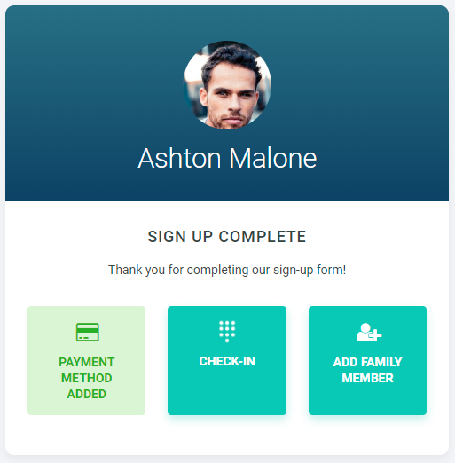 The sign-up form captures basic details, such as name, phone, address, presents the waiver for signature, and allows for membership selection.