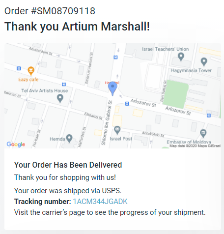 You can update the customer's address in case there's been a mistake, and also provide shipping information on the bottom. Updating the shipping states will send an Email notification to the customer, which you can customize in the Email Templates section. You can add tracking information which will be included in the Email, and on the receipt page the customer sees when they complete an order.