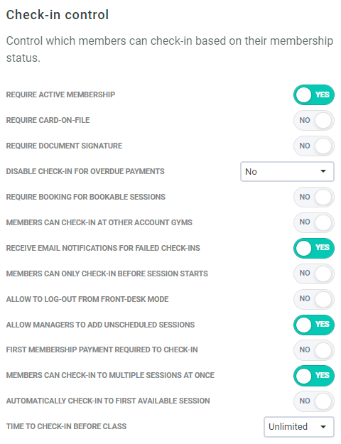 - Members can only check-in before session starts - by default, we provide additional time for members to check-in after the official start time of the session, for up to 45 minutes after the session has ended (to allow late comers to join class immediately, and check-in after class is done). If you enable this setting, members will only be able to check-in before the session start time.