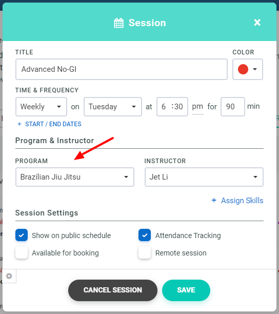 The above is one of the most common source of confusion when a member is not able to check-in, so we'll expand on that a bit. When you set up a session in your schedule, you can pick which program it belongs to, like so -