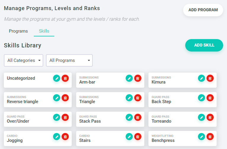 - Program: Another way to organize your skills is by the programs you have set up. Selecting a program, you'll see a dropdown pop-up to select ranks/levels.